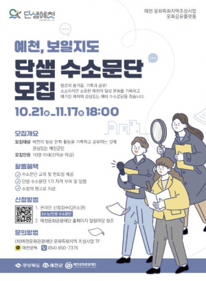 예천군과 (재)예천문화관광재단은 예천 문화특화지역 조성사업의 일환으로 추진하는 ‘예천, 보일지도’의 ‘단샘 수소문단’ 프로그램 참여자를 11월 17일까지 모집한다. ‘예천, 보일지도’의 ‘?....