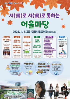 김천시립도서관은 오는 11월 1일 평화남산동 본관에서 독서문화 행사 `서(書)로 서(書)로 통하는 어울마당`을 개최한다. 이번 행사는 독서의 계절을 맞아 책과 관련한 공연·시상·전시·체험 프로그램....
