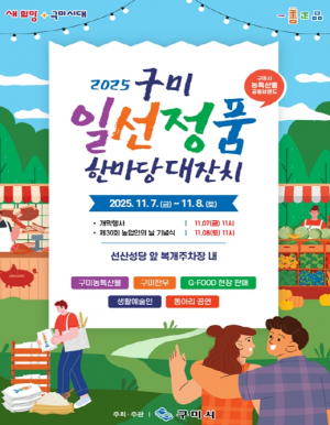 구미시는 11월 7일부터 8일까지 이틀간 선산읍 복개주차장 일원에서 ‘2025 구미 일선정품 한마당 대잔치’를 연다. 올해 처음 선보이는 이번 축제는 ‘농가는 빵빵! 지역은 탄탄!’이라는 슬로건 아래...