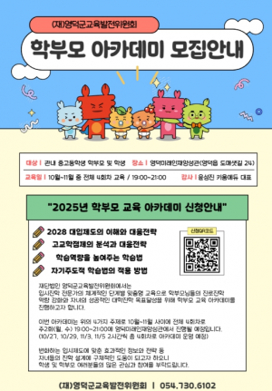 (재)영덕군교육발전위원회는 급변하는 대학입시 환경에 효과적으로 대응하고, 학부모들의 교육 역량 강화를 위해 ‘학부모 교육 아카데미’를 운영한다. 관내 중・고등학생과 학부모를 대상으로 ??....