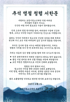 포항시청소년재단, 추석 명절 맞아 ‘청렴 서한문’ 발표
