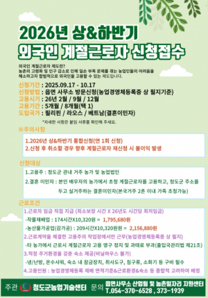 청도군은 농촌 인구감소와 고령화로 인한 농번기 일손 부족 문제 해소를 위해 9월 17일부터 10월 17일까지 `2026년 상·하반기 외국인 계절근로자` 고용 희망농가 수요조사를 실시하고 있다. 이번 ..