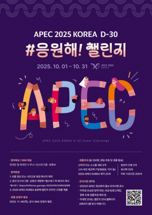 경상북도는 2025년 APEC 정상회의 성공개최를 위해 10월 1일부터 한 달간 전 국민 응원 캠페인 ‘#응원해! 챌린지’를 진행한다고 밝혔다. 이번 캠페인은 2025년 APEC 정상회의 D-30을 맞..