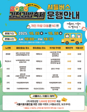 김천시는 오는 10월 25일부터 26일까지 직지사 사명대사공원 일원에서 개최되는 `2025 김천김밥축제`의 성공적인 개최를 위해 교통종합대책을 발표했다. 시는 지난해 축제에서 발생한 주차 혼잡과 차?..