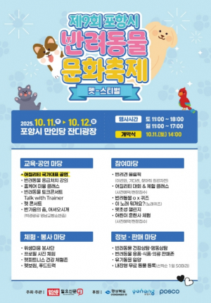 포항시는 오는 10월 11일부터 12일까지 만인당 잔디광장에서 ‘제9회 포항시 반려동물 문화축제’를 개최한다. 축제는 11일 오전 10시부터 오후 6시까지, 12일 오전 10시부터 오후 5시까지 진..