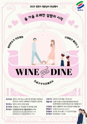 영천시는 오는 10월 12일, 10월 26일, 11월 2일 세 차례에 걸쳐 관내 와이너리에서 미혼남녀를 위한 특별한 만남 프로그램 ‘2025 영천愛 와인·다인(wine·dine)’을 개최한다. 이번 ..