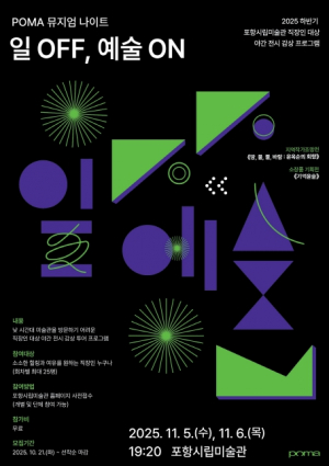 포항시립미술관은 오는 11월 5일부터 6일까지 양일간 직장인을 대상으로 한 야간 전시 감상 프로그램 ‘POMA 뮤지엄 나이트: 일 OFF, 예술 ON’을 운영한다. 이번 프로그램은 평일 낮 시간대 ..