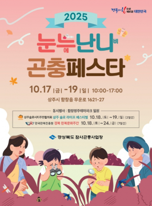 경상북도 잠사곤충사업장은 17일부터 19일 3일간 잠사곤충사업장 일원에서‘2025 눈누(에)난나(비) 곤충페스타’를 개최한다. 올해 15회째 맞는‘2025 눈누난나 곤충페스타’는 누에와 나비를 주제로 ..