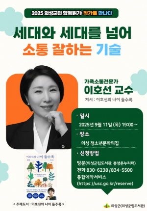 의성군은 오는 9월 11일 의성군 청소년문화의집 공연장에서 가족소통전문가 이호선 교수를 초청해 `세대와 세대를 넘어 소통 잘하는 기술` 북콘서트를 개최한다고 밝혔다. 이호선 교수는 숭실사이??....