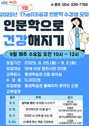 영천시 평생학습관은 ‘2025년 하반기 The(더) 공감 인문학 특강’ 9월 수강생을 8월 25일부터 9월 2일까지 모집한다고 밝혔다. 이번 특강은 ‘인문학으로 건강해지기’라는 주제로 진행되며, 다양한..