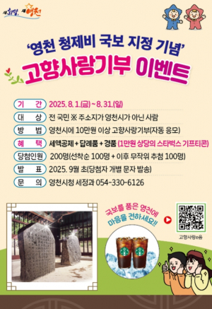 영천시는 지난 6월 20일 영천 청제비가 국보로 지정된 것을 기념해, 8월 한 달간 고향사랑기부 이벤트를 진행한다고 31일 밝혔다. 이번 이벤트는 ‘국보를 품은 영천에 마음을 전하세요!’라는 슬로??..