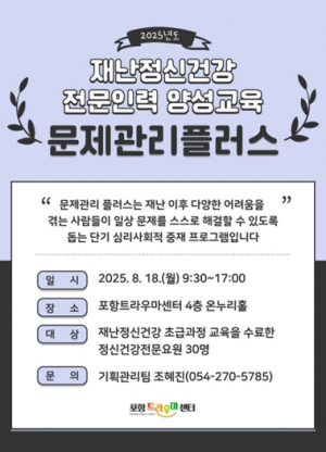 포항트라우마센터는 오는 18일 재난 이후 심리적 어려움을 겪는 이들의 회복을 돕기 위한 ‘문제관리플러스(PM+)’ 교육을 실시한다고 밝혔다. 이번 교육은 재난 정신건강 지원체계 내 전문인력의 역?....