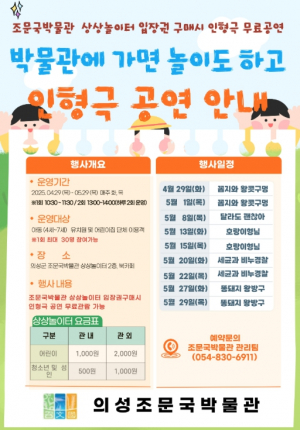 의성군 조문국박물관은 봄철 육아보육기관의 현장학습이 활발해짐에 따라, 유치원 및 어린이집 아동을 위한 인형극 프로그램 『박물관에 가면 놀이도 하고』를 운영한다고 밝혔다. 이 프로그램??....