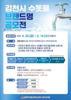 김천시 맑은물사업소는 오는 5월 14일까지 수돗물 브랜드명을 공모한다고 밝혔다. 김천시 수돗물의 원수는 매우 깨끗한 1급 하천수로 생산하고 있어 수질이 매우 우수하다. 이번 공모는 김천시 수돗??....