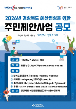 경상북도는 예산편성의 투명성과 공정성을 높이기 위해 7월 25일까지 2026년도 경상북도 주민참여예산 편성을 위한 주민 제안 사업을 공모한다. 주민참여예산제는 도민이 직접 사업을 제안하고 예산??....