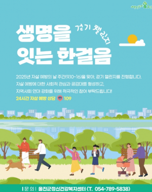 울진군 보건소·정신건강복지센터는 2025년 자살예방의 날 (9월10일)을 맞아 9월 10일부터 16일까지를‘자살예방 주간’으로 지정하고, 군민과 함께하는‘생명을 잇는 한걸음’걷기 챌린지를 진행한다.....