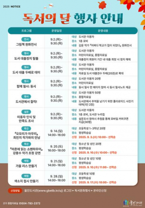 경상북도교육청 울진도서관은 9월 독서의 달을 맞아 책 읽기의 중요성을 알리고 지역주민의 독서 흥미를 높이고자 오는 9월 1일부터 30일까지 다양한 독서문화행사를 운영한다. 이번 독서의 달 행사....