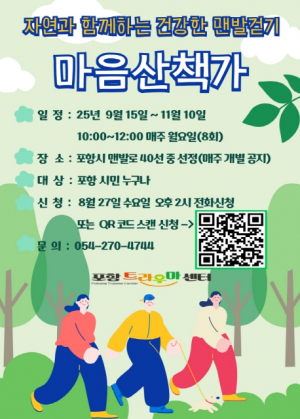 포항시 북구보건소 트라우마센터는 트라우마를 경험한 시민들의 치유와 건강 증진을 위해 2025년 ‘자연과 함께하는 건강한 맨발걷기-함께 걸어요! 마음산책가’ 프로그램 참여자를 모집한다. 맨?....