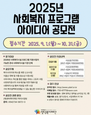 (재)영덕복지재단은 지역의 특성을 반영한 새로운 사회복지 정책, 사업, 서비스를 발굴하기 위해 ‘2025 사회복지 아이디어 공모전’을 개최한다. 본 공모전은 주민 복지 수요와 지역발전에 부합하는 ....
