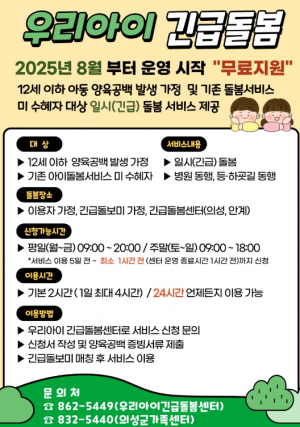 의성군은 의성군가족센터와 협력해 8월부터 ‘우리아이 긴급돌봄’ 운영을 시작한다고 밝혔다. ‘우리아이 긴급돌봄’은 의성군 자체사업으로, 만 12세 이하 자녀를 둔 맞벌이 가정이나 기존 아이??....