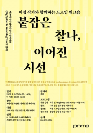 포항시립미술관은 제20회 장두건미술상 수상작가전 ‘Big Spider Is Watching You!’ 연계 프로그램으로, 이정 작가와 함께하는 드로잉 워크숍 ‘붙잡은 찰나, 이어진 시선’을 9월 6일과..