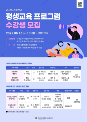 상북도교육청 봉화도서관(관장 장낙희)은 어린이, 학부모 및 일반인을 대상으로 8월 13일부터 하반기 평생교육 프로그램 수강생을 모집한다. 2025년 하반기 평생교육 프로그램은 초등학생 대상 토요 ....