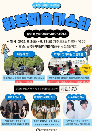 군위문화관광재단은 8월 2일부터 22일까지 매주 토요일 대구 군위군 산성면에 위치한 삼국유사 배움터, 화본마을에서 `화본 예술 페스타`를 개최한다. 이번 행사는‘강석원 화백과 함께하는 어반스?....