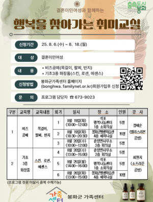 봉화군가족센터는 8월 19일부터 26일까지 결혼이민여성 35명을 대상으로 ‘행복을 찾아가는 취미교실 체험활동’ 프로그램을 진행한다. 이번 체험 프로그램은 총 6회기 과정으로 석포 행복나눔센터 1....
