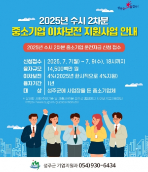 성주군은 지역 중소기업의 자금난 해소와 경영안정 지원을 위해 중소기업 운전자금 2차 수시분 융자지원 사업을 시행한다. 이번 지원 규모는 총 145억 원으로, 7월 7일부터 9일까지 3일간 신청을 받는??..