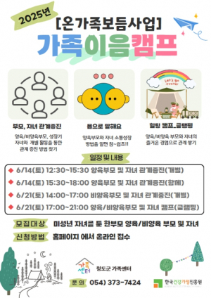 청도군가족센터(센터장 송근진)는 오는 14일과 21일에 면접교섭서비스 사업의 일환으로 소통과 성장을 위한‘2025 가족이음캠프’를 운영할 예정이다. 가족이음캠프는 미성년 자녀를 둔 이혼(별거) 10....
