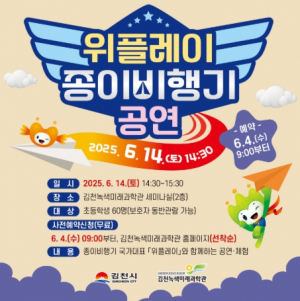 김천시는 오는 6월 14일 오후 2시 30분 김천녹색미래과학관 2층 세미나실에서 종이비행기 국가대표팀 ‘위플레이’를 초청해 `종이비행기 곡예 공연`을 개최한다. 이번 공연은 초등학생을 대상으로 ??...