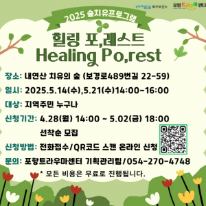 포항시 북구보건소 트라우마센터는 트라우마 회복과 심신 안정을 위한 상반기 숲치유 프로그램 ‘힐링 포,레스트(Healing Po,rest)’를 오는 14일과 21일, 북구 송라면 내연산 치유의 숲에서 운영..