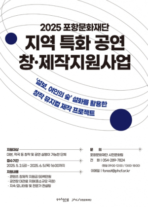 포항문화재단은 포항 지역 설화를 기반으로 한 창작 뮤지컬을 발굴하기 위해 ‘2025 지역 특화 공연 창·제작지원사업’의 공모를 실시하고 내달 5일까지 접수한다. 이번 공모는 전국 문화예술단체를 ....