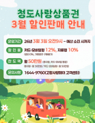 청도군은 지역경제 활성화와 소상공인 지원 강화를 위해 올해 3월부터 카드형 청도사랑상품권 할인율을 기존 10%에서 12%로 인상한다고 밝혔다. ..