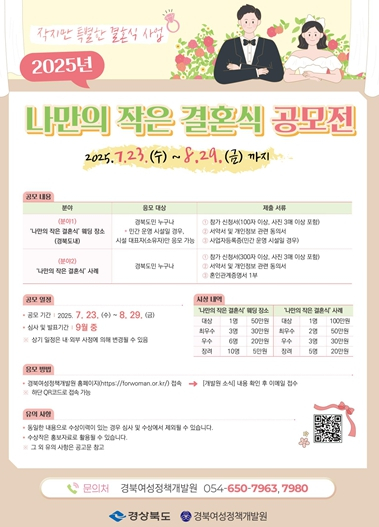 경북도가 ‘적은 비용으로 결혼하고 크게 행복한’ 결혼문화 조성을 위한 지원 사업에 이어 ‘나만의 작은 결혼식’ 공모전을 개최한다. 경북도는 이번 공모전을 통해 작은 결혼식을 위한 다양한 결혼 공간 발굴과 획일적이고 상업화된 예식에서 벗어난 새로운 결혼문화 모델을 제시할 방침이다.공모전은 경북도민이라면 누구나 참여할 수 있고, 총 2개 분야로 나뉘어 진행한다. 첫 번째 분야는 ‘나만의 작은 결혼식’ 결혼(웨딩) 장소 공모로, 도내에 있으면서 작은 결혼식 장소로 활용할 수 있는 공공과 민간이 운영하는 시설이면 모두 응모할 수 있다.접수 때는 ▲장소(시설)명 ▲소재지(주소) ▲추천 사유 ▲장소 사진을 제출하면 되고, 민간 운영 시설은 시설 대표자(소유자)만 응모할 수 있고, 기존 운영 중인 공공예식장, 대형예식장 및 호텔은 대상에서 제외된다.두 번째 분야는 ‘나만의 작은 결혼식’ 사례 공모전이다. 참가자는 ▲사연 및 재미있는 이야기(에피소드) ▲작은 결혼식을 선택하게 된 계기(장소 선택 포함) ▲좋았던 점과 어려웠던 점 등을 담은 작은 결혼식에 대한 상세 내용을 결혼식 현장의 분위기를 보여주는 사진과 함께 제출하면 된다.공모는 이달 23일부터 다음 달 29일까지 신청할 수 있으며, 접수 방법과 제출 서식은 (재)경북여성정책개발원 누리집 내 공고문을 통해 확인할 수 있다.최순규 경북도 저출생대응정책과장은 “이번 공모전을 통해 결혼식장으로 활용이 가능한 다양한 공간을 발굴하고, 작은 결혼식의 감동적인 사례를 널리 알려 관행적인 결혼문화로 인한 경제적 부담을 덜고, 마음으로 축하해 주는 결혼문화를 정착하고자 한다”고 밝혔다.한편, 경북도는 민간 예식장이 아닌 다양한 장소에서 양가 합산 100명 이하의 결혼식에 최대 300만원의 결혼식 비용을 지원하는 ‘작지만 특별한 결혼식’사업을 시행하고 있다. 자세한 사항은 경북여성정책개발원 홈페이지 또는 전화 문의하면 된다.