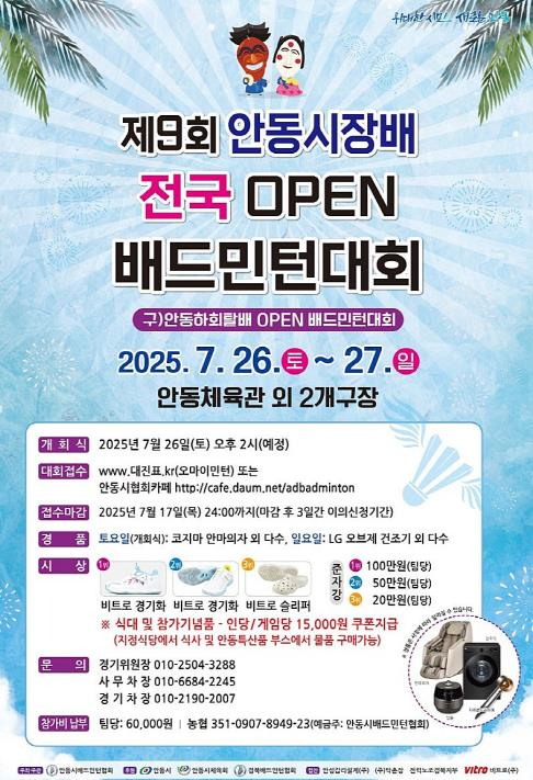 ‘제9회 안동시장배 OPEN 배드민턴대회’가 오는 7월 26일부터 27일까지 이틀간 안동체육관과 안동다목적체육관에서 열린다.이번 대회는 안동시배드민턴협회가 주최․주관하며, 전국 각지에서 모인 배드민턴 동호인 약 1,600여 명이 열띤 경쟁을 펼칠 예정이다.이번 대회는 원래 3월 29일부터 30일까지 개최될 예정이었으나 산불 발생에 따라 참가자의 안전을 고려해 부득이하게 연기, 이번 7월 말에 개최하게 됐다.경기는 연령 및 급수별로 나눠 남자복식, 여자복식, 혼합복식 종목으로 치러지며, 랠리포인트제 25점 1세트 방식으로 진행된다. 예선 리그를 거쳐 본선 토너먼트로 이어지는 방식으로 각 부문별 우승자를 가리게 된다.이번 대회는 전국의 우수한 배드민턴 동호인들이 대거 참가하는 만큼 수준 높은 경기가 펼쳐질 것으로 기대되며, 참가자 간의 화합과 교류의 장이 될 전망이다.안동시 관계자는 “이번 대회를 통해 배드민턴을 사랑하는 전국의 선수 및 동호인들이 함께 어우러져 의미 있는 시간을 보내시길 바라며, 경기장 인근의 낙동강변 산책길과 문화시설도 함께 즐겨보시길 바란다”고 전했다.