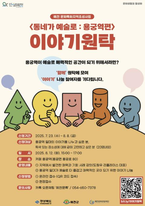 (재)예천문화관광재단은 예천군 문화특화지역 조성사업의 일환으로 진행되는 《동네가 예술로: 용궁역 편》사업 시행 전 군민 아이디어 수렴을 위한 ‘이야기 원탁’ 참여자 모집을 이달 23일부터 8월 8일까지 진행한다.‘이야기 원탁’ 프로그램은 지역민의 생생한 의견을 직접 듣고 이를 향후 해당 사업에 실제로 반영하기 위한 사전 기획의 핵심 과정이다.재단은 ‘이야기 원탁’을 통해 지역 연계자원이 많고, 이야기가 풍부한 용궁역을 중심으로 공간에 대한 주민들의 기억과 감정 그리고 생활 속에서 느낀 생각들을 공유하고, 문화예술 활동으로 연결 가능한 이야기들을 함께 나누며 지역문화 생태계를 함께 만들어갈 예정이다.행사는 8월 12일 오후 3시부터 5시까지 ‘카페 용궁역(용궁로 80)’에서 진행되며, 참여자들은 자유롭고 평등한 테이블 형식의 대화를 통해 용궁역이라는 공간의 예술로 가능성을 논의하게 된다.모집 대상은 용궁역 일대에 대한 이야기를 나누고 싶은 군민 또는 지역에 관심 있는 누구나 가능하며 모집 인원은 20명 내외이다. 신청은 온라인 또는 현장 접수를 통해 가능하며 자세한 사항은 단샘예천 웹사이트를 참조하거나 문화특화지역 조성사업 TF로 문의하면 된다.김학동 이사장은 “이번 이야기 원탁을 통해 주민들의 다양한 의견이 자유롭게 나누어지고, 그 목소리가 실제 사업에 반영되어 눈앞의 변화로 이어지길 기대한다”고 밝혔다.