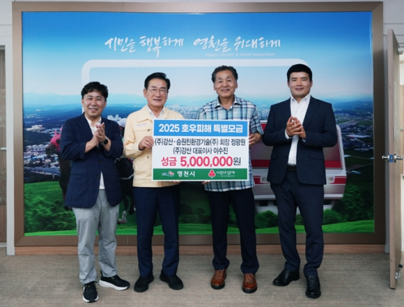 정광원 ㈜강산·승원친환경기술㈜ 회장과 이수진 ㈜강산 대표이사는 23일 호우피해 복구에 써달라며, 영천시에 성금 500만원을 기탁했다.정광원 회장과 이수진 대표는 “최근 전국적인 집중호우로 피해가 속출해 삶의 터전을 잃고 위험에 노출된 이재민을 지원하고, 호우피해 지역의 빠른 복구를 위해 조금이나마 도움이 되었으면 하는 마음에 기탁하게 됐다”며, “어려움을 겪고 있는 이웃들이 조속히 일상으로 돌아가기를 기원한다”고 위로와 격려의 마음을 전했다.정 회장과 이 대표는 지난 4월에도 영남지역 산불피해 지역 주민을 위해 500만원을 기탁했으며, 3월에는 주민의 복지발전을 위해 써달라며 북안면 행복금고에 300만원을 기탁하는 등 매년 후원 물품과 성금을 기탁하고 있으며, 지역사회 기부문화 활성화에 앞장서고 있다.최기문 영천시장은 “재해가 발생할 때마다 앞서서 기탁해주시는 정광원 회장과 이수진 대표께 감사의 인사를 드린다”며 “기탁해주신 성금은 호우피해 지역의 복구와 지원에 사용될 수 있도록 잘 전달하겠다”며 말했다.