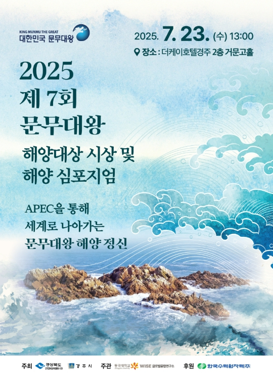 경주시는 23일 오후 1시, 더케이호텔 경주에서 ‘제7회 문무대왕 해양대상 시상식 및 2025 문무대왕 해양 심포지엄’을 개최한다. 이번 행사는 경주시가 주최하고 글로벌융합연구소(소장 이영찬)가 주관하며, 문무대왕의 해양정신과 경주 바다의 가치를 글로벌 관점에서 재조명하고, 이를 미래지향적인 문화콘텐츠로 확장하기 위한 학술 교류의 장으로 마련됐다. 행사에는 김영석 전 해양수산부 장관을 비롯한 신라 역사 및 해양 분야 석학과 유관기관 관계자, 시민 등 300여 명이 참석했다. 심포지엄은 김영석 전 장관의 기조강연 ‘문무대왕의 바다, 미래의 항로 그리고 개방적 해양전략’을 시작으로 ‘APEC을 통해 세계로 나아가는 문무대왕 해양정신’을 주제로 3건의 발표와 종합토론이 진행됐다.‘제7회 문무대왕 해양대상 시상식’에서는 해양재해 예방과 기상 관측 분야에 기여한 박종진 경북대학교 자연과학대학 지구시스템과학부 교수 등 해양과학·산업·교육문화 분야의 공로자에게 해양대상과 특별상이 수여됐다.주낙영 경주시장은 ˝1350년 전에 문무대왕의 해양정신은 오늘날에도 여전히 유효하며, 경주의 소중한 유산˝이라며, ˝이번 행사가 문무대왕 정신과 첨단 기술, 문화가 융합된 글로벌 해양문화도시 경주의 비전을 널리 알리는 계기가 되길 바란다˝고 밝혔다.
