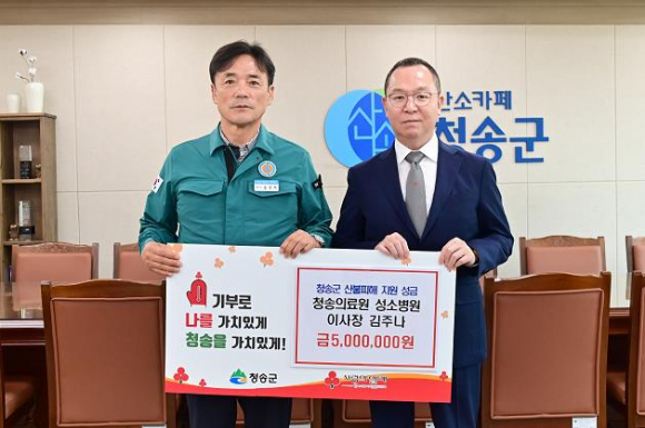 청송군의 산불 피해 복구를 위해 전국 각지에서 온정의 손길이 이어지고 있다. 지난 25일에도 다양한 단체와 개인이 성금과 물품을 기탁하며 피해 주민들에게 큰 위로와 힘을 전했다. 이날 ▲천주교안동교구 1억 원, ▲(주)한국정보통신이 1,000만 원을 기탁했으며, ▲천안 아우내농업·오이공동출하회는 600만 원 상당의 쌀국수 360박스를 전달하며 피해 주민들의 식생활 지원에 동참했다. 또한 ▲빈에듀컬처 장빈 대표는 700만 원 상당의 화장품 1,800개를 기부했고, ▲포천시 영중면 남녀지도자협회는 700만 원, 포천시 영중면 리장 협의회 50만 원의 성금을 보내며 청송군민과 아픔을 함께했다. ▲청송의료원 성소병원 김주나 이사장이 500만 원, 청송의료원·성소병원 직원일동이 626만 원, ▲진보면 각산리 주민일동은 600만 원을 각각 기탁하며 지역사회에 따뜻한 정을 전했다. 아울러 ▲(사)국제라이온스협회 365-A(대구)지구 일구사자회 김홍열 회장 외 회원일동 ▲개인택시 청송군지부도 각각 200만 원을 기부하며 산불 피해 극복을 위한 연대의 마음을 보탰다. 윤경희 청송군수는 “청송을 위해 한마음으로 정성을 모아주신 모든 분들께 진심으로 감사드린다”며, “기탁해주신 소중한 성금과 물품은 산불 피해 주민들의 신속한 복구와 일상 회복을 위해 사용하겠다”라고 밝혔다.