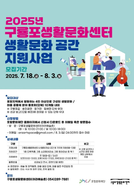포항문화재단은 오는 8월부터 12월까지 지역 내 생활문화 및 마을 공동체 관련 활동 단체를 대상으로 구룡포생활문화센터(아라예술촌)의 공간을 무상으로 제공하는 ‘생활문화 커뮤니티 공간 지원 사업’을 운영한다. 시민의 자발적 문화 활동을 장려하고, 네트워크 형성을 통한 자연스러운 문화 공동체의 성장을 도모하고자 하는 이 사업은 다양한 분야의 예술 창작 또는 마을 공동체 관련 활동을 하는 4인 이상의 단체(동호회)를 대상으로 구룡포생활문화센터의 다목적홀, 소리동아리실, 동아리실 등의 공간과 기자재를 무상으로 지원한다. 모집 기간은 내달 3일까지며 심사를 거쳐 10개 내외의 단체를 선정한다. 선정된 단체는 연말에 열리는 성과 공유회로 그간의 활동 결과를 전시나 공연으로 발표하는 기회를 얻게 된다. 신청 방법 및 자세한 모집 일정은 포항문화재단 누리집에서 확인할 수 있으며, 기타 자세한 문의는 포항문화재단 공간디자인팀으로 하면 된다. 한편 구룡포생활문화센터(아라예술촌)는 화요일부터 토요일까지 오전 10시부터 오후 9시까지, 일요일은 오전 10시부터 오후 6시까지 운영되며, 매주 월요일은 휴관한다. 포항문화재단 관계자는 “시민이 주체가 된 생활문화 커뮤니티를 적극 발굴하고 지원함으로써 지역 문화 공동체 형성에 기여하고자 한다”며 “시민들의 많은 관심과 참여를 바란다”고 전했다.