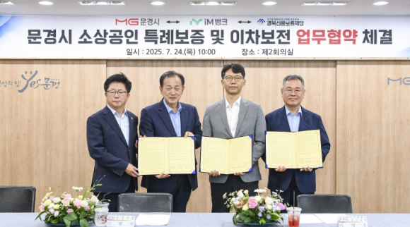 문경시는 지난 24일 시청 제2회의실에서 ㈜아이엠뱅크, 경북신용보증재단과 `문경시 소상공인 특례보증 및 이차보전을 위한 업무협약`을 체결했다. 이번 협약은 사업장 소재지가 문경시에 있는 소상공인을 대상으로 보증대출을 통한 특례보증을 추가 지원하여, 경영부담 완화 및 지역경제 활성화에 기여하기 위해 체결했다. 출연금은 총 6억 원으로 문경시가 3억 원, ㈜아이엠뱅크가 3억 원을 출연했다. 보증금은 72억 원으로 출연금의 12배이다. 문경시는 △특례보증 및 이차보전 지원 업무, ㈜아이엠뱅크는 △본 특례보증 재원출연, 대출 절차 완화 및 보증대출 실행, 경북신용보증재단은 △신용보증서 발급 및 신용보증서의 심사요건 완화 등에 관해 협약했다. 신현국 문경시장은 “이번 협약을 통해 문경시 소상공인들의 경영 안정화에 도움이 됐으면 좋겠다”며, “지역 소상공인의 어려움을 해결하기 위한 시책을 지속적으로 만들어가겠다”라고 했다.