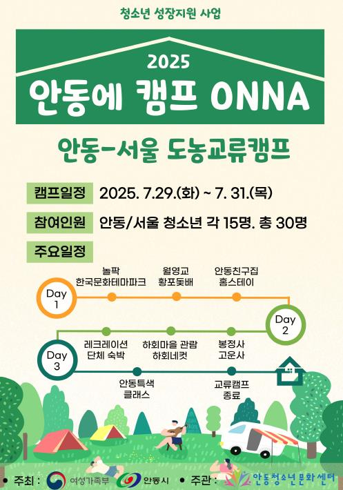 여성가족부와 안동시가 주최하고 안동청소년문화센터가 주관하는 청소년 교류 프로그램 ‘안동에 캠프 ONNA(온나)!’가 오는 7월 29일부터 31일까지 2박 3일간 안동시 일대에서 열린다.이번 캠프는 2025년 안동 산불 당시 서울 청소년들이 보낸 응원의 손편지에서 시작된 인연을 계기로, 서울 친구들에 대한 감사의 화답이자 교류의 장으로서 마련됐다. 안동시와 서울시 청소년 30명이 함께 참여해 안동의 전통문화 체험과 공동체 활동을 통해 우정을 나누고 지역 문화를 배우는 의미 있는 시간을 보낼 예정이다.특히 안동시청소년참여위원회 위원들이 전 일정에 함께하며 서울 청소년들을 환대하고 안내하는 지역 청소년 홍보대사로서의 역할도 수행할 계획이다.주요 프로그램으로는 ▲환영식 ▲한국문화테마파크 및 월영교 탐방을 통한 전통문화 체험 ▲세계문화유산 중심의 역사탐방 ▲안동사과 오란다 만들기 ▲하회탈 장식 만들기 등이 준비돼 있으며, 안동 청소년 가정에서의 1박 홈스테이와 안동시청소년수련원 단체 숙박도 포함돼 있어 서로의 일상과 문화를 나누는 교류의 시간이 될 전망이다.김재열 안동청소년문화센터 관장은 “이번 캠프는 청소년들이 또래 친구들과 어울리며 다양한 문화와 지역의 매력을 자연스럽게 체득할 기회”라며, “안동 청소년들이 지역 문화를 주도적으로 소개하는 과정에서 자긍심과 정주의식을 키우는 데 큰 도움이 될 것”이라고 밝혔다.