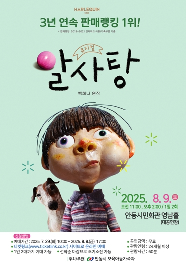 안동시는 오는 8월 9일, 어린이 뮤지컬 『알사탕』 공연을 무료로 개최한다. 이번 공연은 ‘아이행복 사계절 상상놀이’ 여름 프로그램의 일환으로, 무더운 여름철 어린이들이 실내에서 쾌적하게 문화생활을 즐길 수 있도록 기획됐다.공연은 안동시민회관 영남홀(대공연장)에서 오전 11시, 오후 2시 두 차례 진행되며, 24개월 이상 어린이 및 가족 단위 관람객 약 1,400여 명(회당 732석)을 대상으로 한다.공연 관람은 7월 29일 오전 10시부터 8월 8일 오후 5시까지, 티켓링크를 통해 신청할 수 있으며, 회당 1인 2매까지 예매가 가능하도록 제한해 더 많은 시민이 공연을 관람할 수 있도록 했다.뮤지컬 ‘알사탕’은 아동문학계의 노벨상이라 불리는 ‘아스트리드 린드그렌상’을 한국인 최초로 수상한 백희나 작가의 동명 그림책을 원작으로 한 공연으로, 어린이들의 눈과 귀를 사로잡는 무대 연출과 감동적인 메시지가 어우러져 가족 단위 관람객들에게 큰 호응이 기대된다.권기창 안동시장은 “야외 행사뿐만 아니라 실내에서 어린이와 가족이 함께 즐길 수 있는 문화프로그램을 지속적으로 마련할 계획”이라며 “어린이들에게는 상상력과 감성을 키우는 시간이, 가족들에게는 시원한 여름날의 특별한 추억이 되길 기대한다”고 전했다.