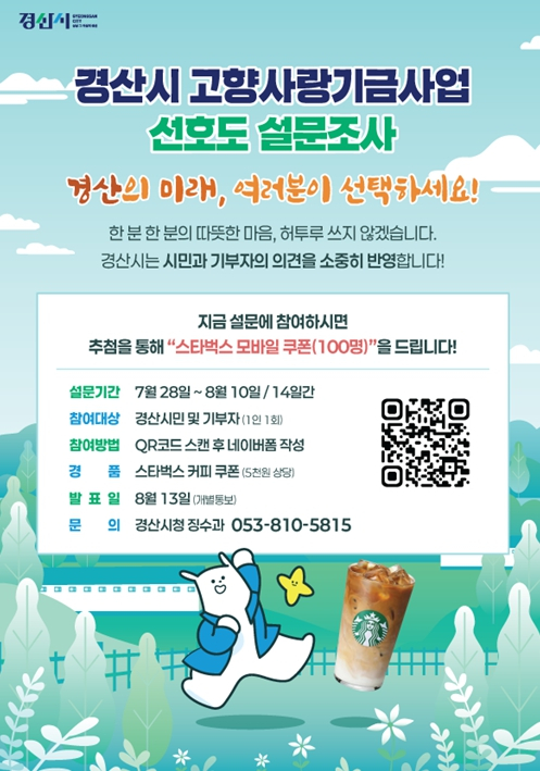 경산시는 2026년 고향사랑기금사업을 선정하기 전 시민과 기부자의 의견을 반영하고자 7월 28일부터 8월 10일까지 14일간 “경산시 고향사랑기금사업 선호도 설문조사”를 실시한다고 밝혔다. 2026년 고향사랑기금사업은 3월 대국민 공모와 5월 내부 직원 공모를 거쳐 총 10건의 사업 후보를 선정했으며, 이번 설문조사를 통해 시민과 기부자의 의견을 반영하여 이후 고향사랑기금심의위원회에서 최종결정하게 된다.시는 설문조사 참여도를 높이기 위해 조사에 참여한 시민과 기부자 중 추첨을 통해 총 100명에게 5천원 상당의 커피 교환권을 지급하는 이벤트를 진행한다. 이로써 더 많은 시민과 기부자들의 참여가 이어져 설문의 신뢰도를 높일 수 있을 것으로 기대된다.고향사랑기부제 설문 참여 방법은 7월 28일부터 8월 10일 기간 중 경산고향사랑 홈페이지팝업창 QR코드를 스캔하거나 인터넷 주소창에 “https://naver.me/FtGv3nIE”를 입력하여 설문조사를 진행할 수 있다.