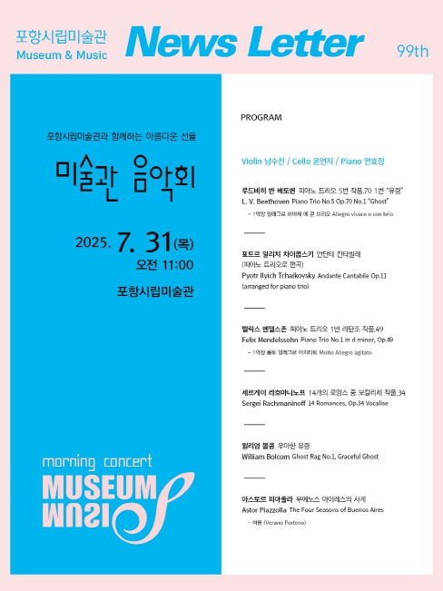 포항시립미술관은 31일 오전 11시 제99회 미술관 음악회 ‘MUSEUM · MUSIC’을 개최한다. 이번 음악회는 베토벤, 차이콥스키, 멘델스존, 라흐마니노프 등 세계적인 작곡가들의 명곡으로 구성된 피아노 3중주(Trio) 무대로 마련된다. 미술관의 스틸 조각 작품들과 어우러진 특별한 공간에서 펼쳐지는 이번 무대는 관람객에게 깊은 예술적 감동을 선사할 예정이다. 연주에는 바이올리니스트 남수진, 첼리스트 윤연지, 피아니스트 연효정이 참여한다. 세 연주자는 정통 클래식은 물론 현대적 감성이 담긴 작품까지 폭넓은 프로그램으로 피아노 트리오의 다채로운 매력을 선보인다. 공연 프로그램은 베토벤의 ‘피아노 3중주 5번 Op.70 No.1’, 차이콥스키의 ‘안단테 칸타빌레’, 멘델스존의 ‘피아노 3중주 1번 라단조’, 라흐마니노프의 ‘보칼리제’, 윌리엄 볼콤의 ‘유령 래그’, 피아졸라의 ‘부에노스아이레스의 사계 – 여름’ 등 고전에서 현대, 클래식에서 탱고까지 아우르는 폭넓은 레퍼토리로 구성됐다. 출연진 또한 국내외에서 활발히 활동 중인 실력파 음악가들로, 바이올리니스트 남수진은 서울대학교와 미국 텍사스 주립대학교에서 학위를 받고 울산 중구 심포니오케스트라와 USP 챔버 오케스트라의 악장, 카메라타 울산 음악감독으로 활동하고 있다. 첼리스트 윤연지는 서울대학교와 미국 인디애나대학교를 졸업하고 다수의 국제 콩쿠르에서 입상했으며, 현재 퍼듀대학교 음악학과 교수로 재직 중이다. 피아니스트 연효정은 서울대학교와 미국 텍사스 오스틴대학교에서 박사과정을 수료했으며, 활발한 연주 활동은 물론 피아노 편곡집 출간을 통해 교육과 창작을 병행하고 있다. 미술관 음악회는 매월 마지막 주 목요일에 열리며, 미술관을 찾는 관람객 누구나 무료로 즐길 수 있다. 기획 및 작품 해설은 임희도 음악감독이며, 문의는 포항시립미술관으로 하면 된다.