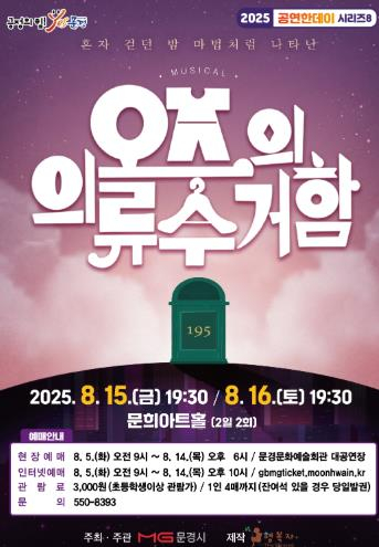 문화예술회관에서는 여름방학을 맞아 온 가족이 함께 관람할 수 있는 뮤지컬 ‘오즈의 의류 수거함’을 8월 15일 19:30, 16일 19:30에 문희아트홀에서 개최한다.이번 공연은 자음과 모음 청소년 문학상을 수상한 유영민 작가의 ‘오즈의 의류 수거함’소설을 원작으로 만들어진 공연이며, 주인공 도로시가 돈을 벌어 호주로 떠나기 위해 매일 밤 의류 수거함 속의 헌 옷을 빼내어 팔고 의류 수거함을 통해서 195, 마녀, 마마, 숙자 등을 만나 외롭고 소외된 사람들이 연대하여 상처들을 치유해 나가는 내용이다. 각자 여러 가지 이유로 상처받은 사람들이 모여 서로를 보듬고 함께 치유해 나가는 훈훈한 이야기를 통해 희망과 따뜻한 감동의 메시지를 전달하여 문경 관객들에게 깊은 울림과 감동을 선사할 것으로 기대된다. 입장권은 전석 3,000원(초등학생이상관람가)이며, 오는8월 5일 오전 9시부터 현장예매(대공연장)와 인터넷예매가 가능하다. 자세한 사항은문경시청홈페이지에서 확인할수있다.