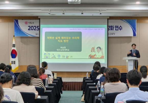 경북교육청은 29일, 경주시에 있는 더케이호텔 경주에서 학습지원대상학생의 수업 내 개별 맞춤 지원 강화를 위해 초등교사 120명을 대상으로 하반기 기초학력 전담교사 역량 강화 연수를 개최했다고 밝혔다. 이번 연수는 기초학력 전담교사를 비롯해 학습지원 담당 교원, 저학년 담임교사 중 희망자를 대상으로, 2학기 기초학력 전담교사제의 효과적인 운영을 준비하고, 학습지원대상학생에 대한 맞춤형 지원 역량을 높이기 위해 마련됐다. 특히, 초등 저학년 수학 교과 학습에 어려움을 겪는 학생들을 위한 수리력 지도와 사회정서 지원을 연수 핵심 주제로 삼아, 현장 교사의 실제적 지도 역량을 강화하는 데 집중했다. 오전 연수는 ‘저학년 쉽고 재미있는 수리력 지도 방안’을 주제로 진행됐으며, △수세기 진단과 지도 방법 △알고리즘 오개념/오류와 지도 방법 △관계적 이해를 통한 수리력 강화와 연산전략 △수학체험활동 ‘똑똑! 수학탐험대’ 등의 실제적인 지도 사례가 공유됐다. 참가자들은 수리력의 개념을 쉽게 풀어내고 흥미를 유발하는 수업 전략에 대해 이해를 넓히는 시간을 가졌다. 오후에는 ‘학습지원대상학생의 심리 및 사회정서 지도법’을 주제로 강의와 활동이 이어졌다. 학습지원대상학생은 단순한 학습 부진뿐만 아니라 심리·정서적인 복합 요인으로 인해 학습에 어려움을 겪는 경우가 많으므로, 교사의 공감적 상담과 정서적 지지가 무엇보다 중요함을 강조했다. 이와 함께 연수 참가자들은 사례 중심의 체험활동을 통해 정서 조절력과 자존감, 학업 효능감을 높이는 실질적인 지도법을 함께 익혔다. 임종식 교육감은 “기초학력은 곧 인권이라는 인식 속에서, 학습과 정서가 함께 성장할 수 있도록 단위 학교의 촘촘한 지원이 절실하다”라며, “앞으로도 학생 개인의 어려움과 특성에 맞는 맞춤형 학습지원 체계를 강화해 기초학력 보장에 최선을 다하겠다”라고 말했다.