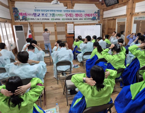 대설위 상주향교에서는 7월 26∼27일(1박 2일) 동안 상주향교 명륜당에서 국가유산청의 우리고장 국가유산 활용사업인 “상(賞)주고 상(償) 받으며 향교에서 놀아보자!”라는 주제로 “마이(my) 향교(숙박형) – 우리는 잼나는 선비가족!” 프로그램을 추진하였다.참석자는 고도 상주지역의 향족인 상산김씨(商山金氏) 종원으로서 전국에 있는 대학생은 누구나 참여토록 하여 서울을 비롯하여 전국에서 골고루 참석하였다.무더운 날씨임에도 불구하고 상산김씨 시조 단소가 있는 상주시 신봉동 봉의재에서의 참배와 김삼균 종회장님의 특강을 마치고 바로 대설위 상주향교의 우리고장 국가유산 활용사업인 “마이(my)향교” 프로그램에 참여하였다.상주향교에 도착하여 남자는 도포와 유건을, 여자는 당의로 갈아입고 대성전 알묘를 봉행한 후, 김명희 전교가 상주향교 대성전의 규모와 역사, 성현들에 대한 소개, 동무와 서무에 대해 설명을 하였다.이어, 유영봉 강사가 진행하는 활인심방(活人心方) 체험은 자기 몸의 건강관리 체험으로 생소한 말로써 모두가 궁금증을 가지고 프로그램에 임하였다. 그리고 임현숙 강사의 전통다도 교육과 체험도 참석자들로부터 찬사를 받았다.이어, 동서대학교 김재곤 교수의 ‘AI 시대를 사는 청년들에게’란 주제에 이어, 김상보 강사의 ‘보학상식과 제례’에 대한 강의로 첫날을 마무리 하면서 친교의 시간으로 하루 일과를 마무리하였다.이튿 날에는 오전7시부터 권해룡 강사가 국학기공 체험을, 조식 후에는 고명환 강사가 진행하는 국궁체험으로, 프로그램이 흥미롭게 진행되었다. 이어, 조희열 강사의 전통가정언어에 대한 강의로 일정을 마무리 하였다.이번 마이향교의 숙박형 프로그램에 상주를 처음 찾은 전국의 상산김씨 대학생들은 상주향교의 위용에 놀라며 훌륭한 교육 및 체험에 높은 만족도를 보였으며, 우리 조상님 뿌리찾기 교육에 참여한 것을 자랑스럽게 느꼈다고 소감을 밝혔다.한편, 김명희 전교는 “상산김씨는 상주시를 관향으로 삼아 고려시대부터 우리 고장에서 뿌리내리고 지역의 중추적인 역할을 해 온 명문 세족으로 이번 기회에 마이(my)향교 프로그램에 참석하게 된 것을 축하드린다”고 하였다.상주향교의 우리고장 국가유산 활용사업은 4년째 진행하는 사업으로 국비와 지방비를 지원받아 상주향교의 전통과 향교의 기능을 알리는 국가유산청 공모사업이다.