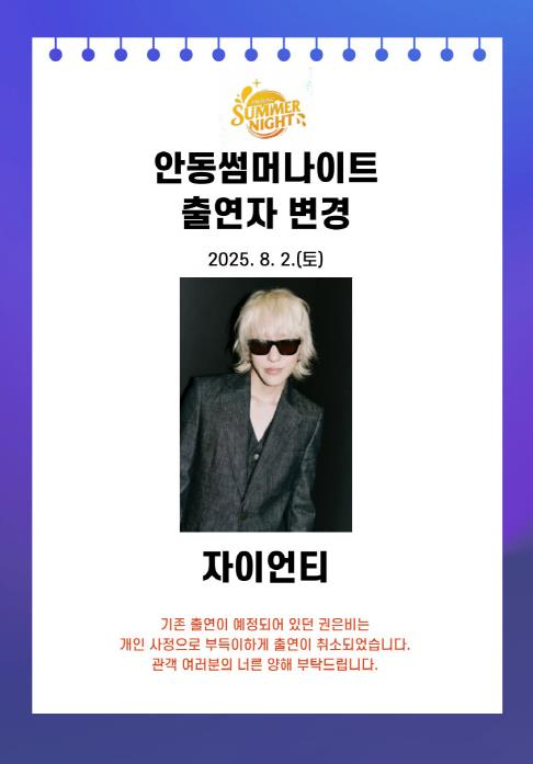 성황리에 진행되고 있는 ‘2025 안동 수(水)페스타’의 야간 공연 ‘안동썸머나이트’ 8월 2일(토) 무대 출연진이 일부 변경됐다.당초 이날 무대에 오를 예정이었던 가수 권은비는 건강상의 이유로 출연이 어렵다는 뜻을 주최 측에 전달해왔으며, 이에 따라 주최 측은 자이언티의 출연을 새롭게 확정했다.자이언티는 대표곡 ‘양화대교’로 잘 알려진 힙합․R·B 싱어송라이터로, 특유의 감성적인 음악성과 독창적인 보컬 스타일로 폭넓은 팬층을 보유하고 있다. 이번 무대에서는 한여름 밤 분위기를 더욱 뜨겁게 달굴 감각적인 공연을 선보일 예정이다.한편, ‘안동썸머나이트’는 8월 1일 DJ수라를 시작으로, 2일 자이언티, 3일 하하·스컬이 차례로 출연해 축제의 밤을 풍성하게 장식한다.안동시 관계자는 “출연진에 일부 변동이 있었지만, 축제의 열기와 감동을 이어갈 수 있도록 준비에 만전을 기하고 있다”며 “관람객들이 안전하고 즐겁게 공연을 즐길 수 있도록 최선을 다하겠다”고 전했다.